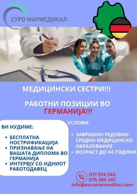 Зошто да не изберете ?EУРО МАРМЕДИКАЛ значи избор за професионализам, сигурност и долгорочен успех во вашиот пат за работа во Германија. Ние ви нудиме не само вработување, туку и целосна поддршка во процесот на интеграција Со нас, вашиот успех е наш приоритет,.