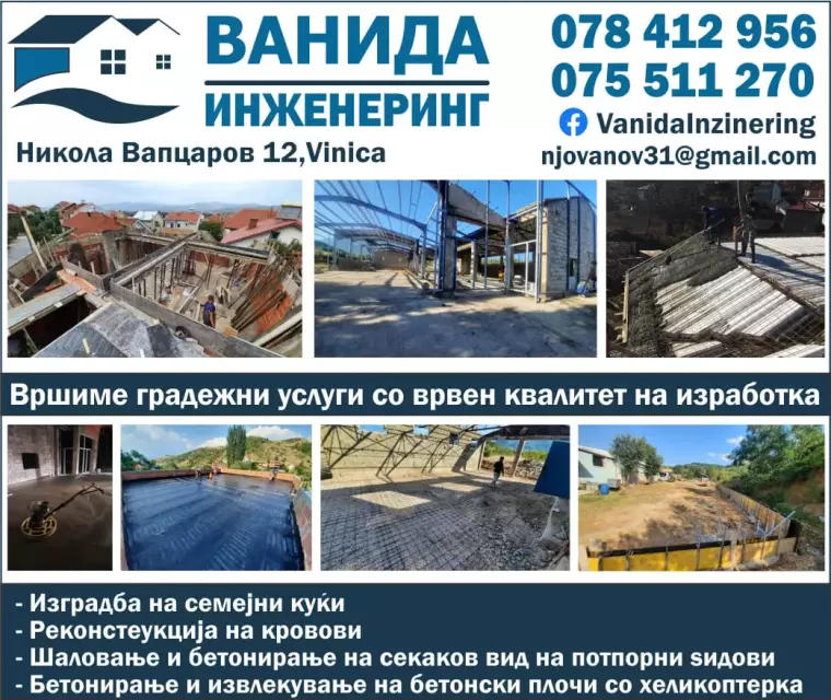 Ние нудиме целосни решенија за подготовка на теренот, кои вклучуваат употреба на современа механизација и високо квалитетни материјали. Нашиот тим составен од искусни инженери и специјализирани работници ќе го изведе секој проект со максимална прецизност и професионализам, почитувајќи ги сите договорени рокови и услови. Без разлика дали се работи за мал станбен објект или поголем градежен зафат, ВАНИДА-ИНЖИНЕРИНГ е компанијата на која можете да се потпрете за безбедно и стабилно поставување на основата на вашиот објект.