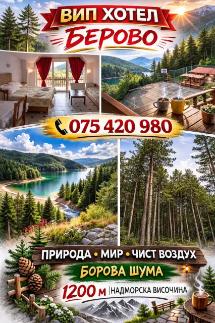 Добредојдовте во Вип Апарт-Хотел Берово – идеален избор за вашиот одмор во срцето на природата! Сместен во живописното Берово, нашето место нуди топла атмосфера, удобност и квалитетни услуги, кои ќе ги задоволат вашите највисоки очекувања. Со вклучен појадок, кетеринг за ручек и вечера, и широк спектар на содржини за сите генерации, Вип Апарт-Хотел Берово е совршен избор за ученици, семејства и сите љубители на природата. Придружете ни се за незаборавен одмор!