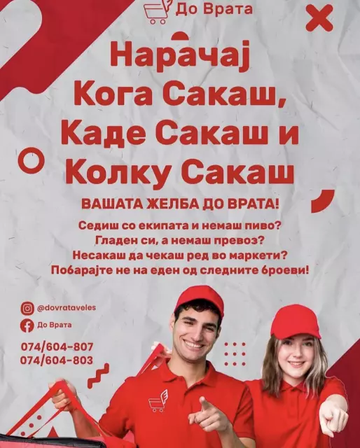 So DO VRATA, narackata e lesna, udobna i fleksibilna – od lokalnite restorani, kafani i prodavnici do vashiot dom ili rabotno mesto. Nasiot flot na elektrichni motori gi obezbeduva brzata i ekoloski prijatna dostava, a podrshkata na lokalni biznisi garantira najdobrite i najsvezhi proizvodi vo Veles. Povikajte, porachajte i dozvolete ni da go olaksame i oplemenime vashiot den, so kompletno reshenie za site vashi porachki.