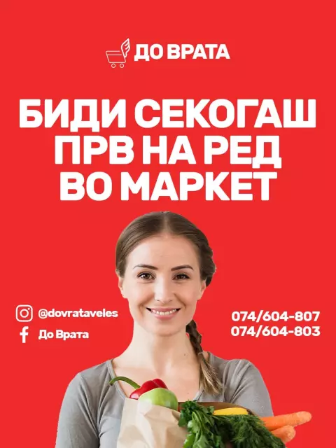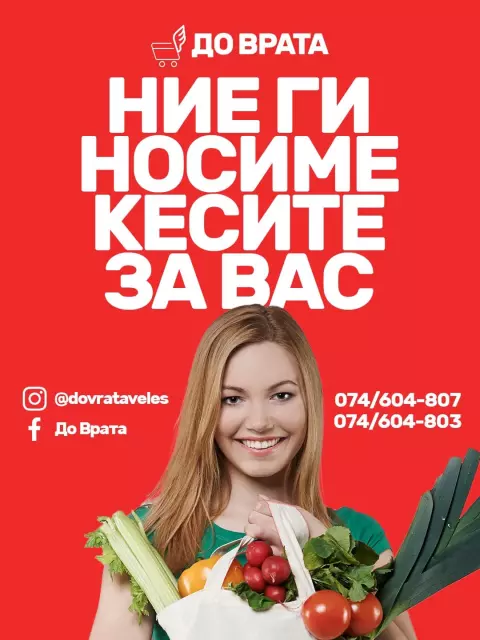 Sekoj od nas ponekogash se naogja vo situacija koga nema vreme ili moznost da izlezete od doma. Dokolku ste vo takva situacija, DO VRATA e tukа da ja donese hranata do vashata vrata vo najkratko vreme. Bez razlika dali ste na rabota, doma so semeјstvoto ili na nekoja vazhna obvrska, nie ke vi gi doneseme najvkusnite obroci od najdobrite restorani vo Veles.