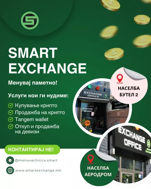 Vo finansiskiot svet kade sekunda može da napravi razlika, doverbata i profesionalnosta se se. Bez razlika dali menuvate tradicionalni valuti ili digitalni sredstva, vi treba partner koj ke vi ponudi sigurna, brza i povolna usluga – bez stres i bez skrieni troškovi. SMART Exchange DOO Skopje e tokmu toj izbor! Kako licencirana menuvacnica od Narodnata banka na Republika Severna Makedonija (NBRSM), nie ja nosime sigurnosta na slednoto nivo. So dve moderni lokacii vo Butel i Aerodrom, kako i partner-ekspozitura vo Gevgelija, nudime finansiski uslugi koi kombiniraat tehnologija, doverba i grizha za klientite.